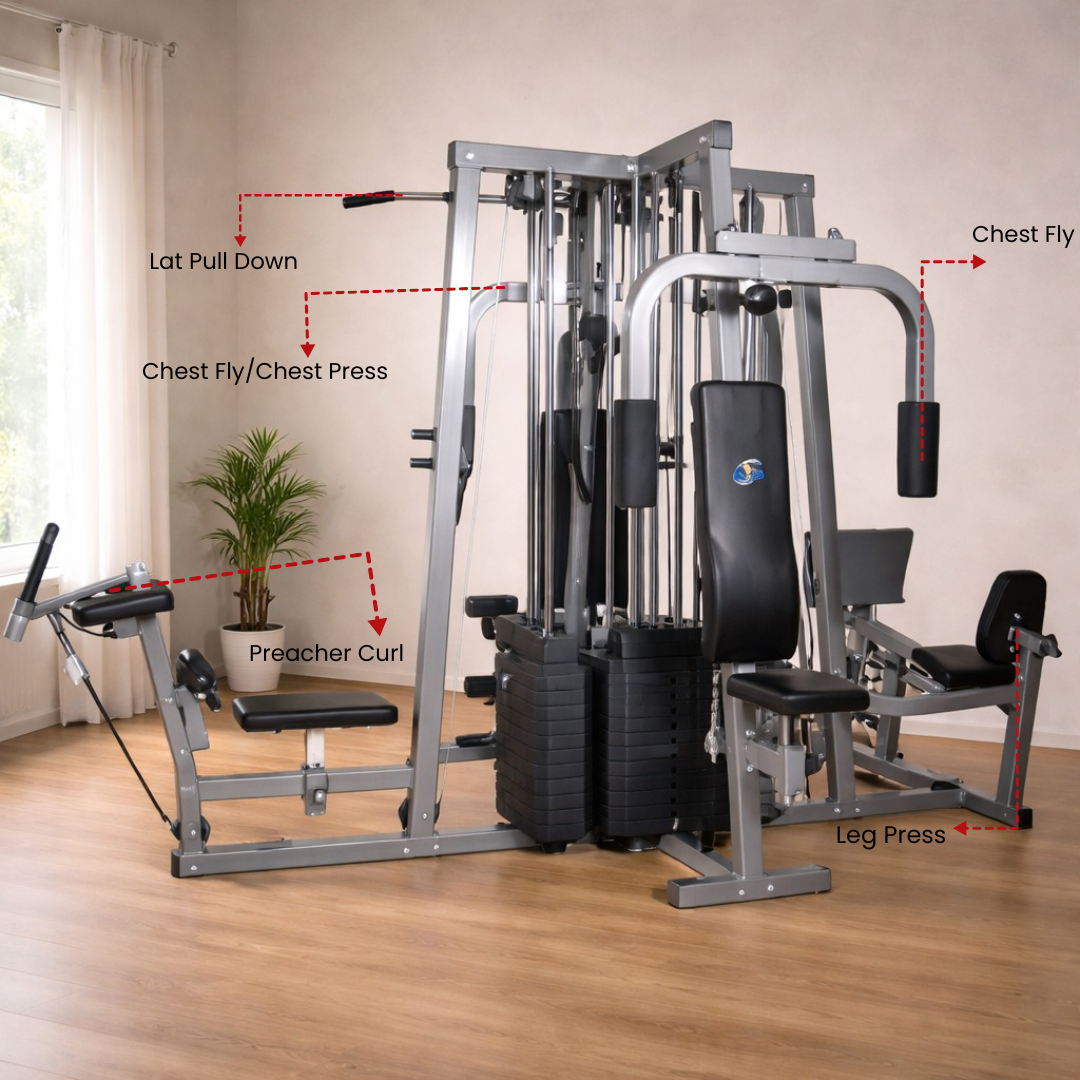 The Aerofit AF-305 4 Station Multi Gym is a powerful, space-efficient Home Gym Machine designed for families and serious fitness users who want versatility without overcrowding their workout area. With a compact footprint of 132” (L) × 85” (W) × 90” (H), it delivers a complete multi-user training setup while maintaining a clean, organized layout suitable for home or light commercial use.