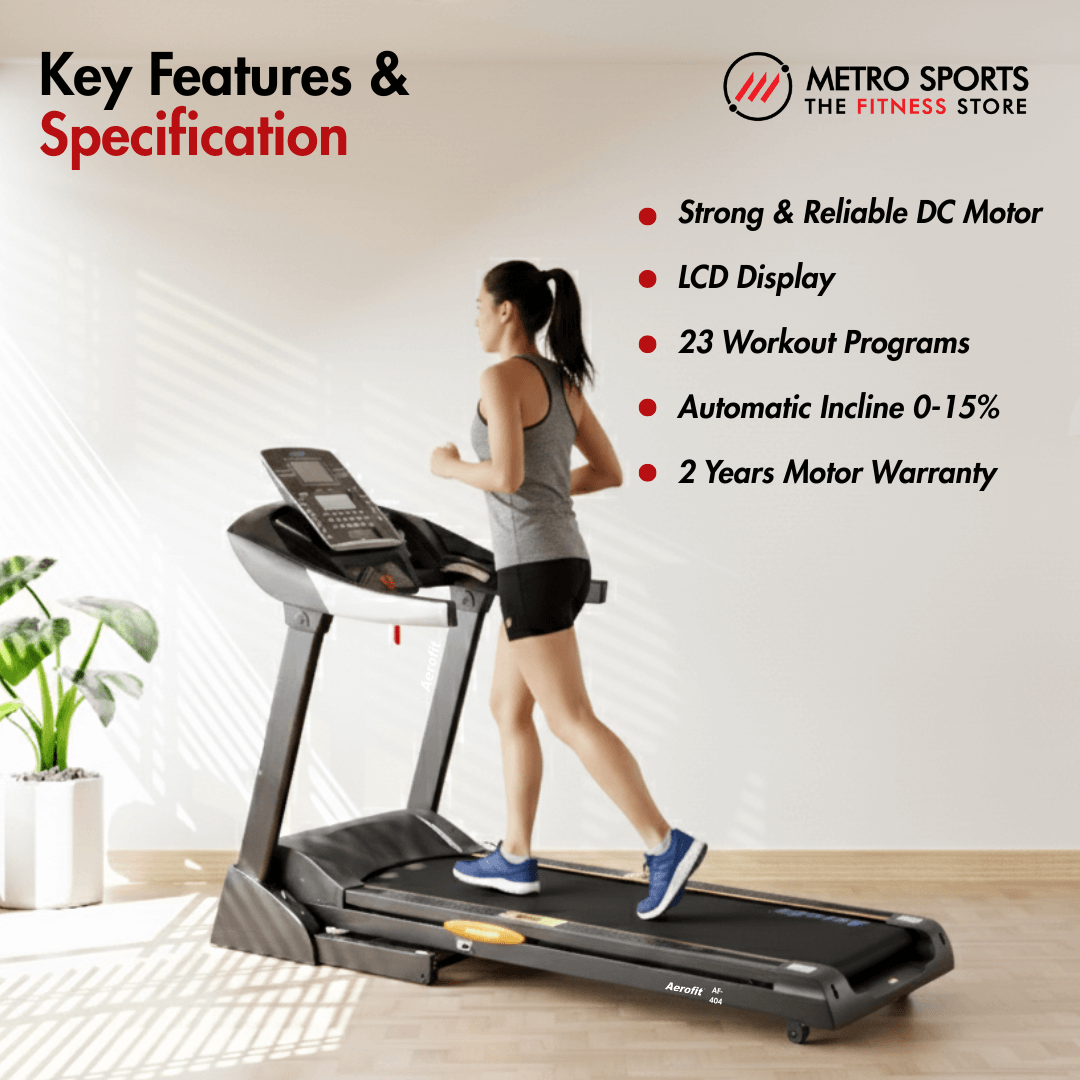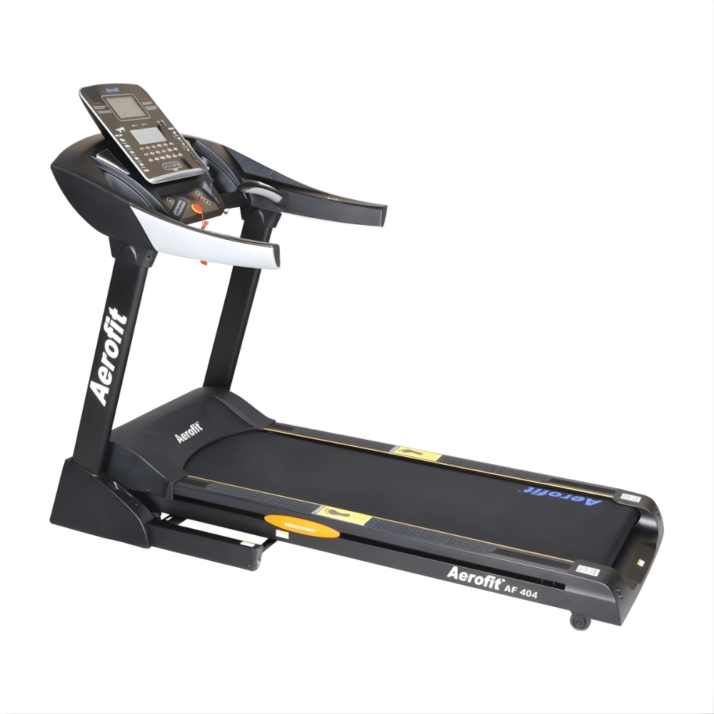The Aerofit AF-404 Treadmill is designed as a powerful domestic treadmill option for users who want gym-level performance at home. It comes with a sturdy DC motor that delivers 3.0 HP continuous duty and an impressive 6.0 HP peak duty, which ensures smooth and reliable performance for daily home workouts. With a spacious running deck measuring 60″ x 21″, this machine provides ample room for comfortable walking, jogging, and running sessions.