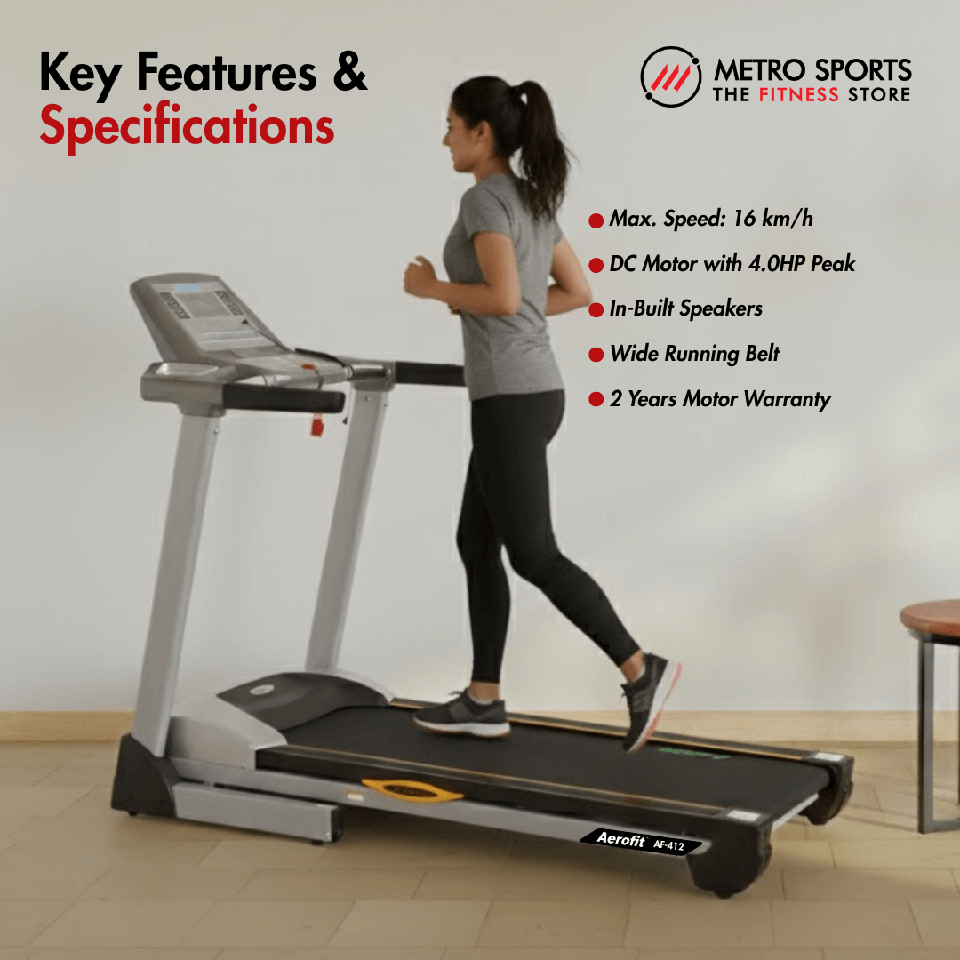 The in-built speaker allows you to enjoy music via MP3 or iPod during, making cardio sessions more engaging. In terms of durability and safety, the AF-412 supports a maximum user weight of 120 kg, making it strong enough for most home users. Its motor warranty of 2 years and 1-year warranty on other parts provide confidence and long-term value, especially when compared with lower-end domestic treadmill models.