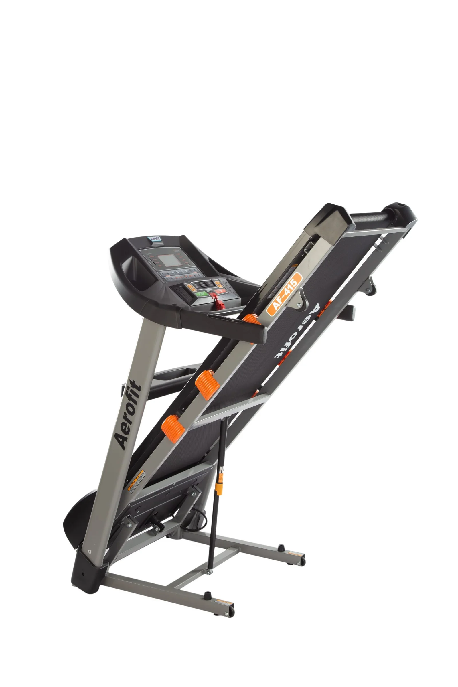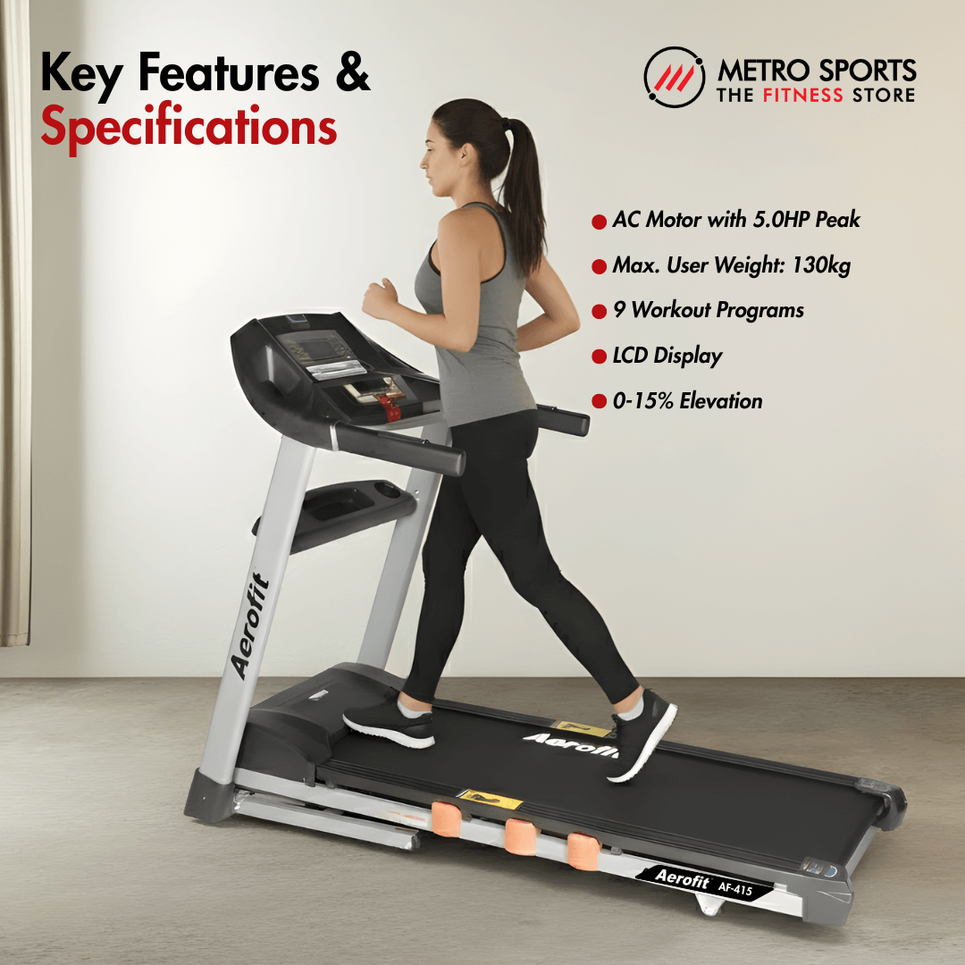 The Aerofit AF-415 Treadmill is a powerful and reliable domestic treadmill designed for users who want professional-grade performance at home. Built with a robust AC motor offering 2.5 HP continuous duty and 5.0 HP peak, this machine ensures smooth and consistent operation during long hours of cardio workouts.