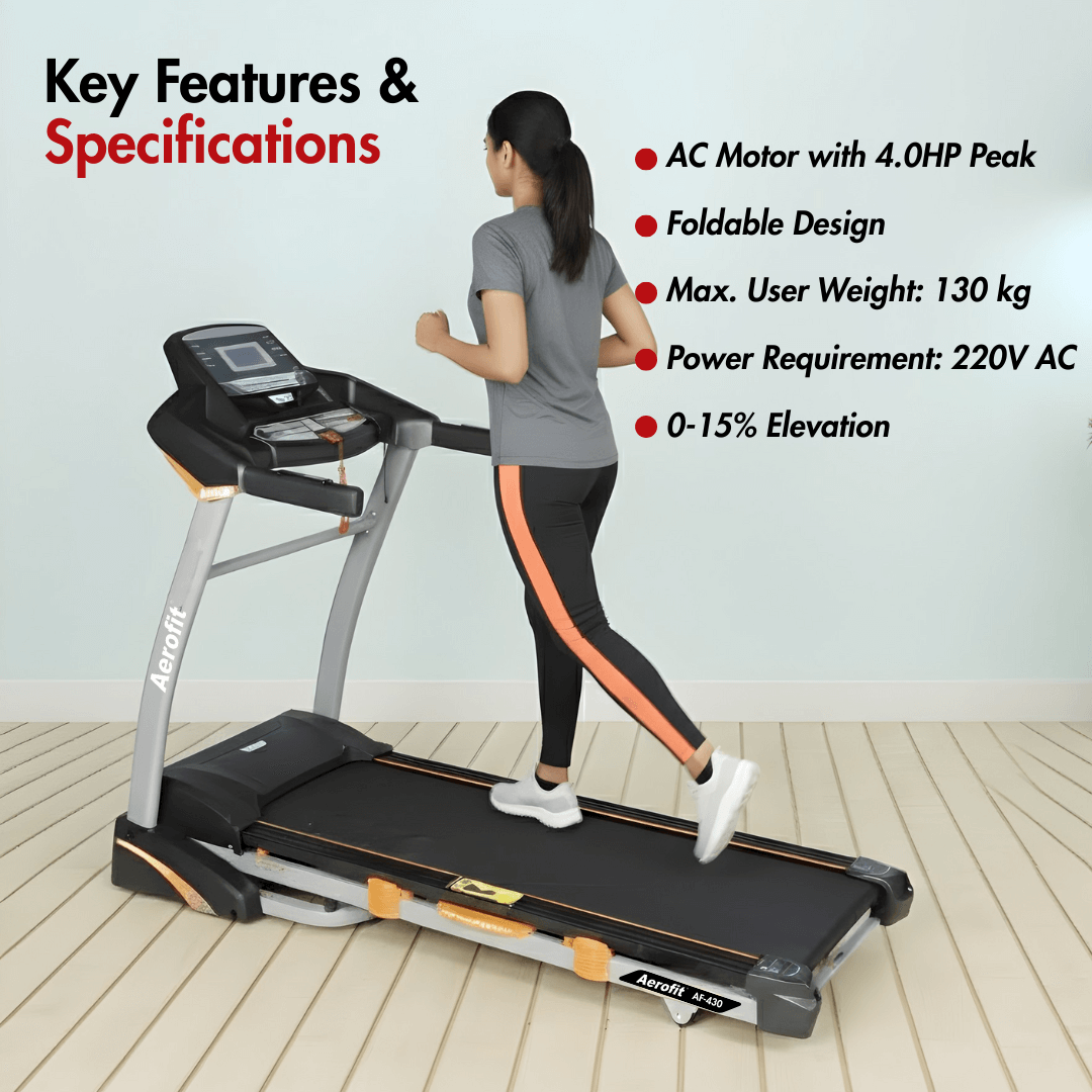 AEROFIT AF-430 Treadmill I 5 Years Motor Warranty I AC Motor with 4.0HP Peak Duty I Max. Speed: 16km/h I 0-15% Elevation I Durable Home Running Machine