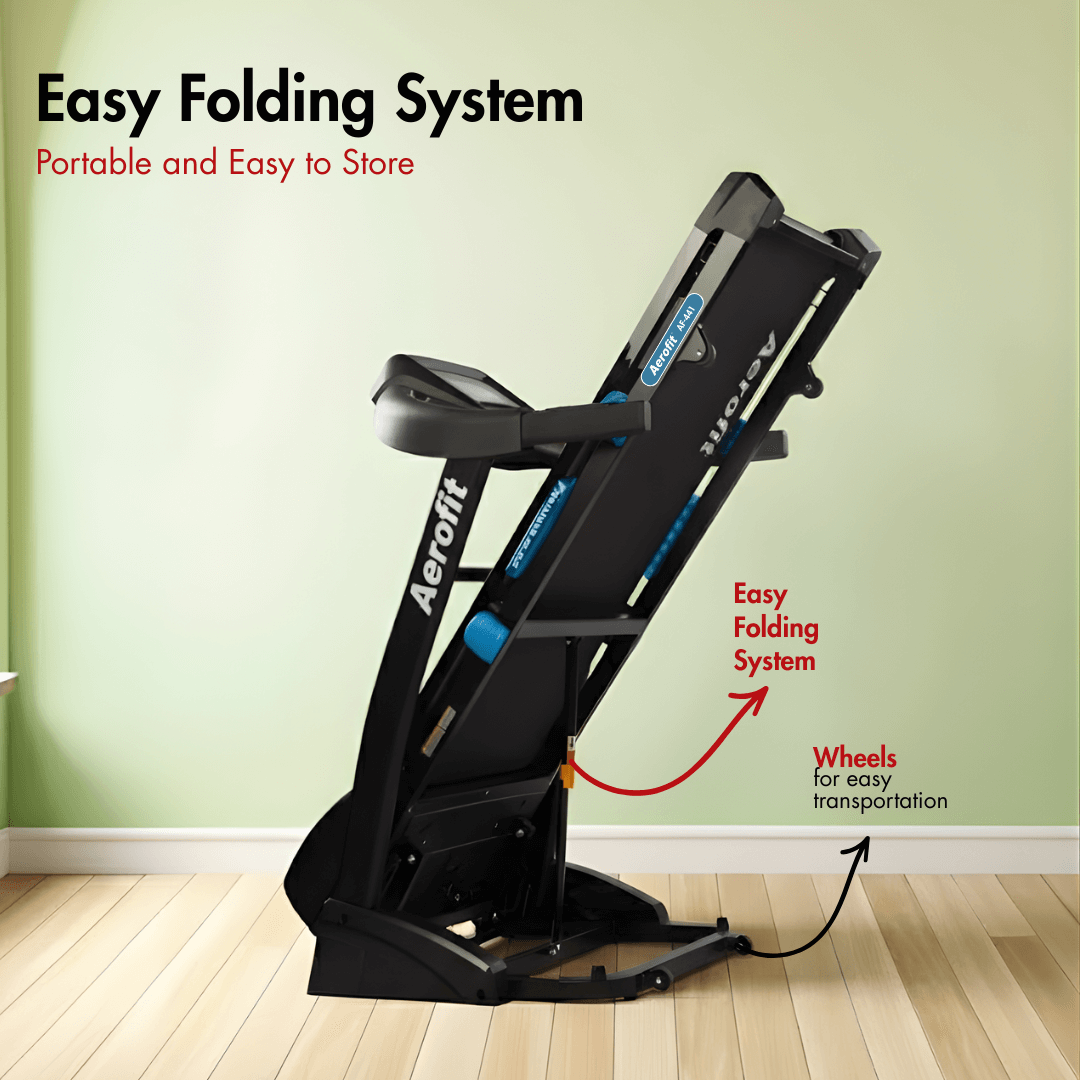 Built with a durable AC Motor offering 2.5 HP continuous duty and 5.0 HP peak duty, the Aerofit AF-441 Treadmill ensures smooth performance whether you prefer light jogging or full-intensity treadmill for home running. Its speed range of 1 to 18 km/h allows both beginners and seasoned runners to customize their cardio sessions with ease. The AF-441 is engineered to fit perfectly into any home gym setup, thanks to its space-efficient dimensions of 72″ (L) x 32″ (W) x 55″ (H). You also get a spacious 56″ x 19″ running surface, which gives plenty of room for safe and comfortable movements.