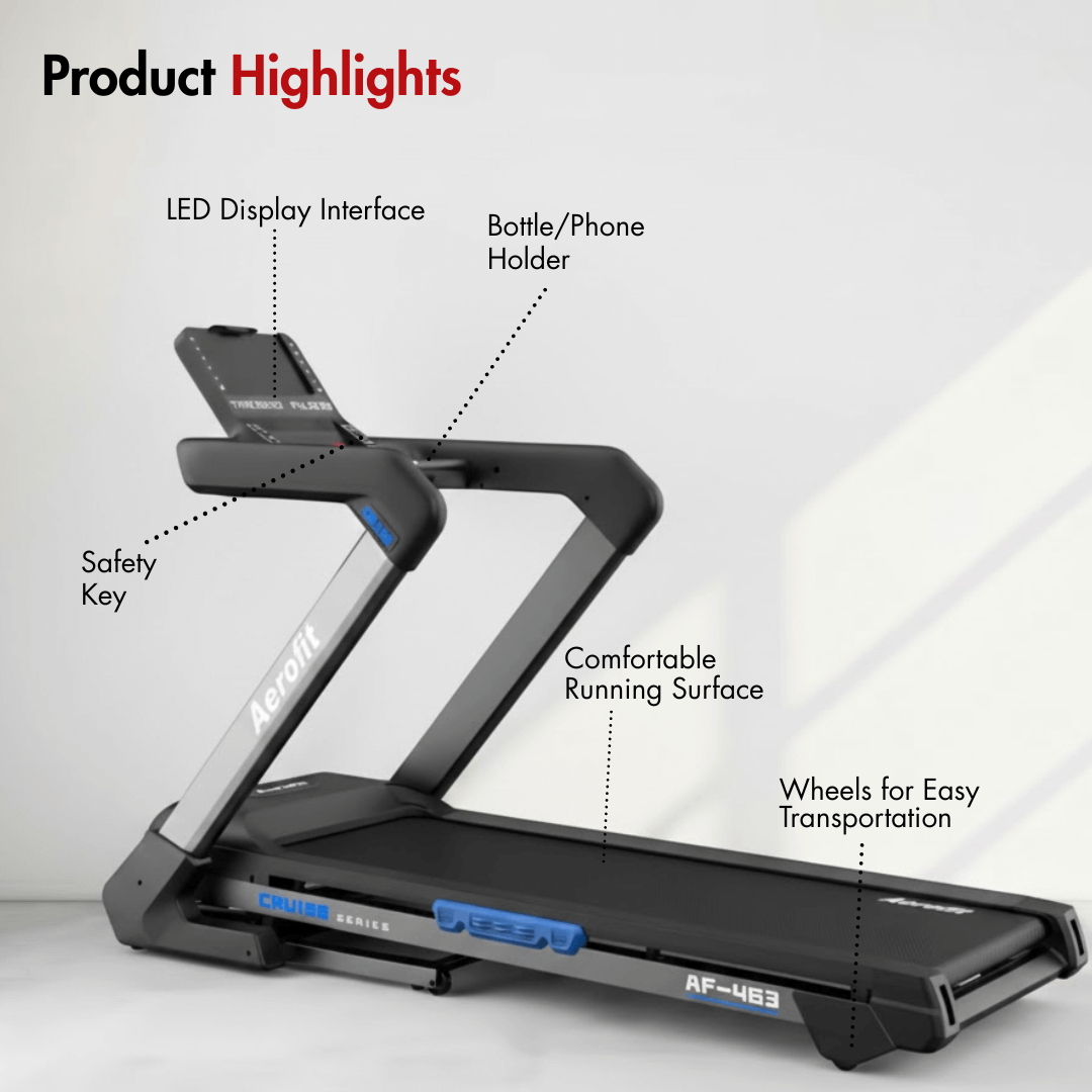 Built with a solid frame and a premium finish, the Aerofit AF-463 Treadmill blends comfort, durability, and advanced functionality, making it an excellent choice for home fitness enthusiasts who want professional-grade results. Powered by a 3.0 HP continuous duty AC motor with a 6.0 HP peak output, it ensures smooth operation even during long cardio sessions.