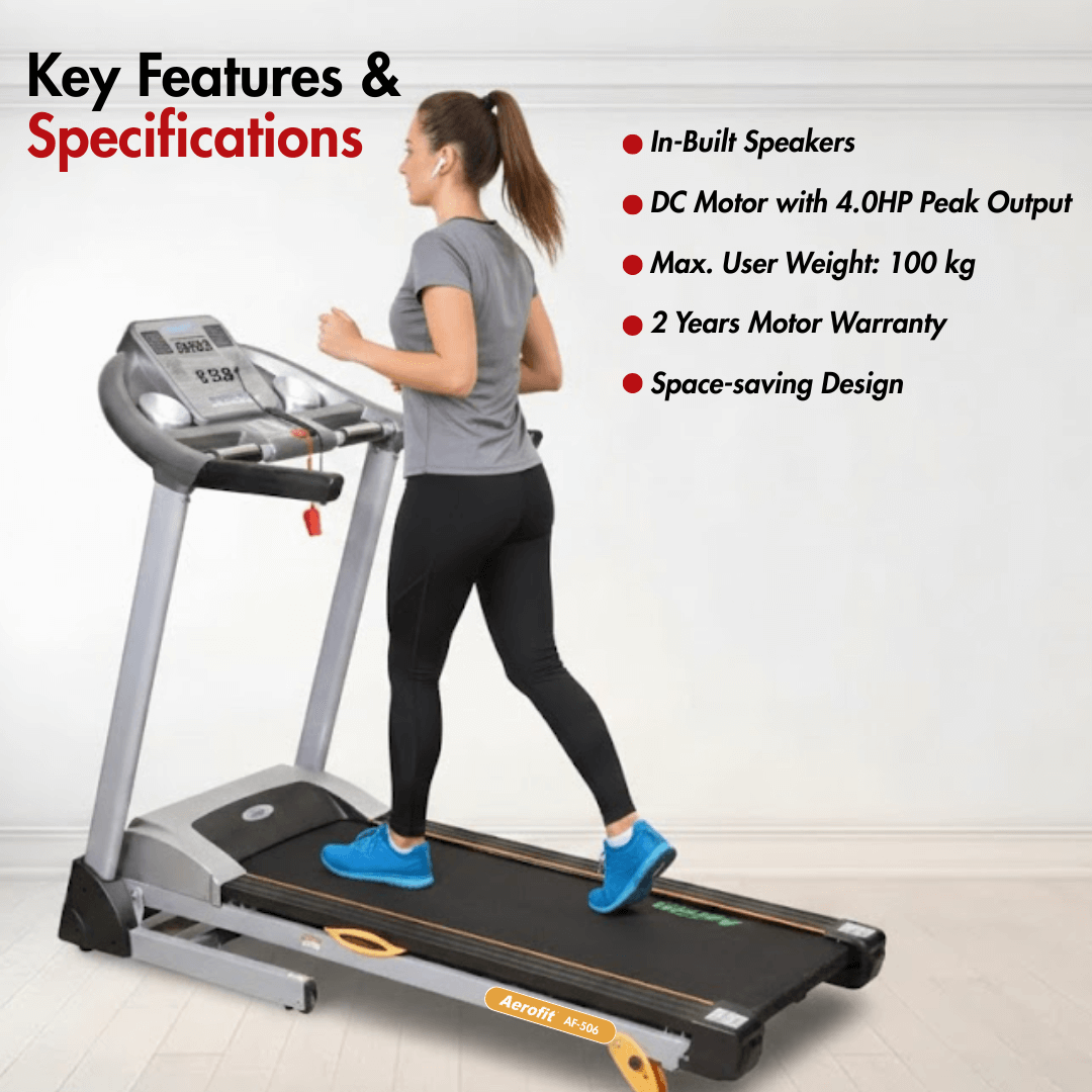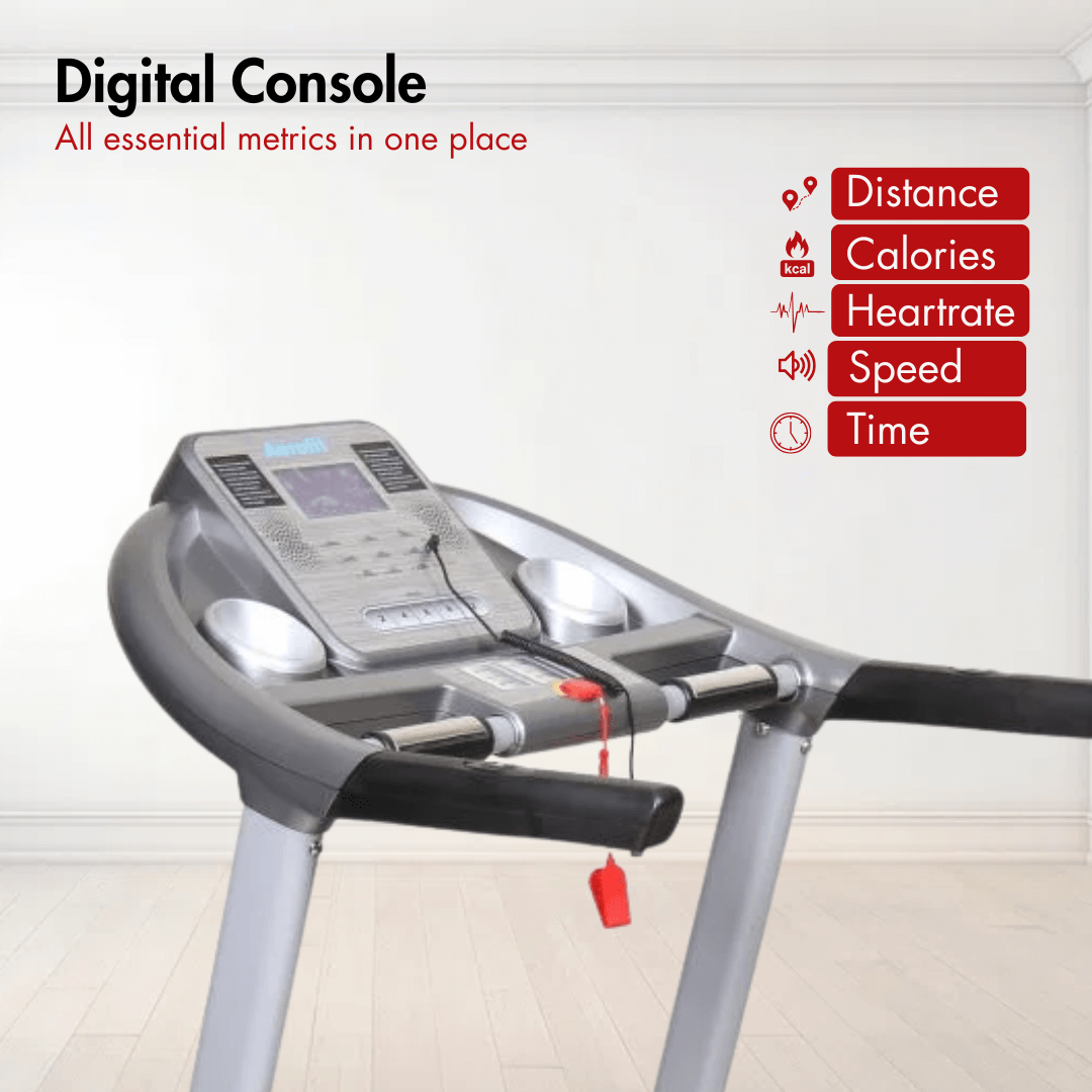 This treadmill also comes with in-built speakers supporting MP3 and iPod connectivity, which makes longer cardio sessions more enjoyable. With a maximum user weight capacity of 100 kg, the AF-506 is well-suited for regular household use. Backed by a 2-year motor warranty and 1-year coverage on other parts, it’s a dependable choice for anyone building a personal gym setup.