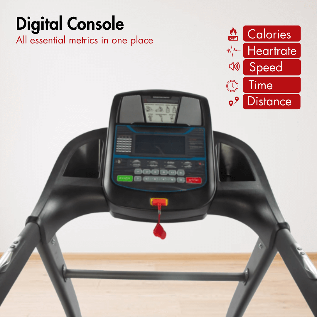 Its overall compact dimensions (68” x 30” x 53”) allow it to fit easily into small apartments or your dedicated exercise rooms without overwhelming the space. The running surface of 54” x 18” provides enough space for smooth and natural cardio workouts, which is a key consideration for a treadmill for home use. This treadmill comes equipped with LCD display with blue backlight which presents your essential workout data clearly, which helps users in tracking their progress more easily.
