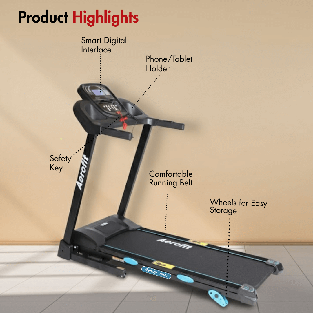 The Aerofit AF-542 Treadmill is a smartly engineered domestic treadmill designed for users who want reliable performance, smooth motion, and long-term durability for daily cardio routines at home. Powered by a 2.0 HP AC motor (4.0 HP peak), the AF-542 ensures stable operation across a speed range of 1.0 to 14 km/h, making it suitable for walking, jogging, and steady running sessions.
