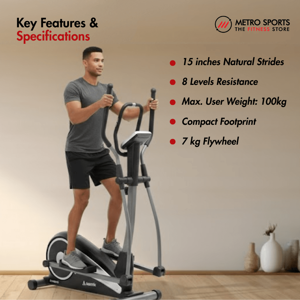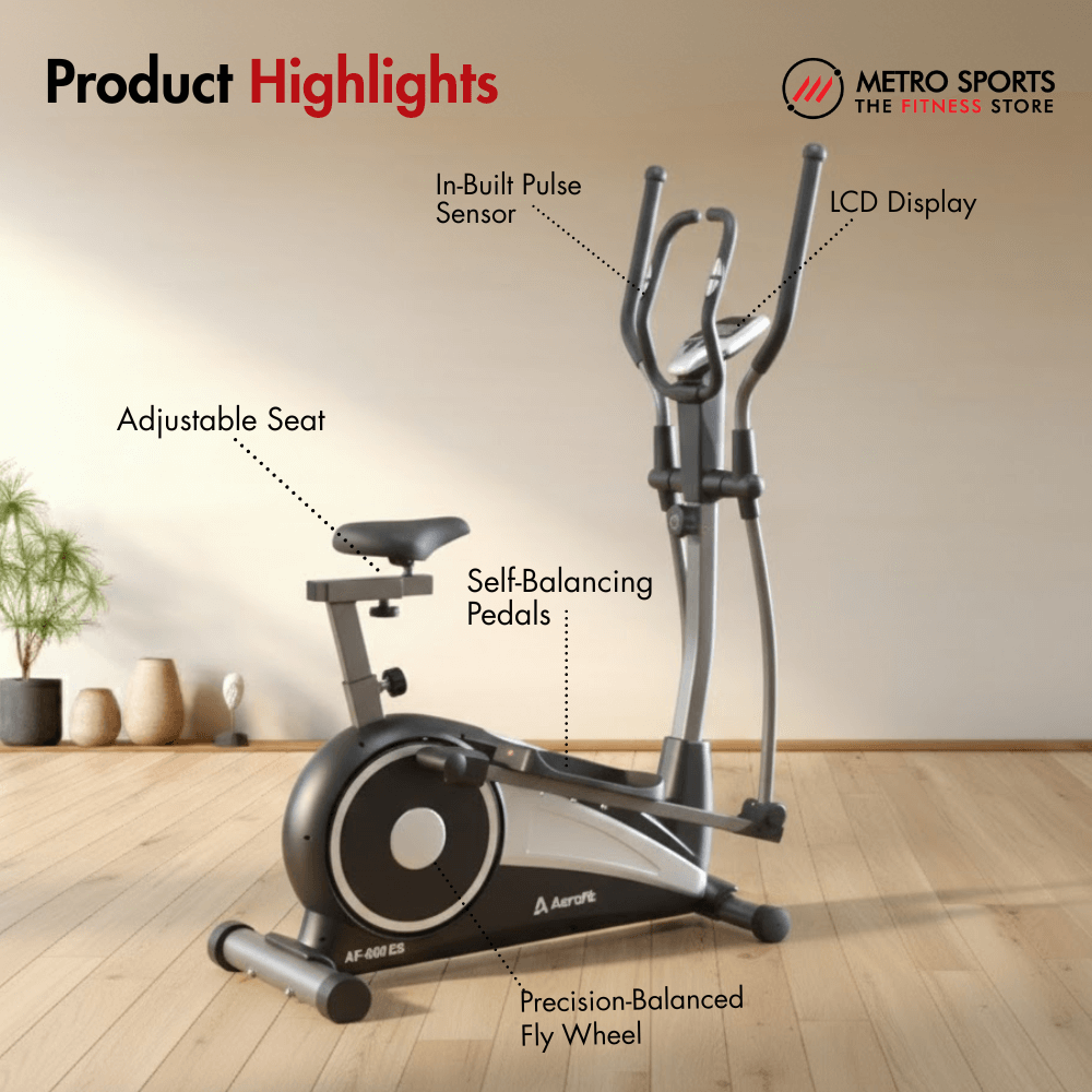 The Aerofit AF-600ES Elliptical Cross Trainer is a thoughtfully designed domestic elliptical cross trainer built for users who want effective, low-impact workouts within the comfort of their home. With a compact yet stable structure, it fits well into modern living spaces while still delivering a smooth and natural cardio experience. Its dimensions of 53” (L) × 28” (W) × 65” (H) strike a perfect balance between space efficiency and workout comfort, making it suitable for daily home fitness routines.