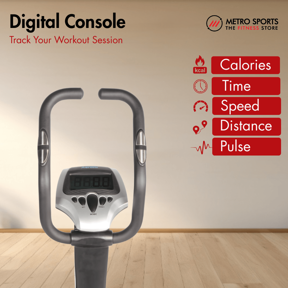 The computerized LCD console displays real-time workout data including time, distance, speed, calories, odometer, and pulse. Built-in hand-grip sensors allow easy heart-rate tracking during sessions. Users can also preset workout goals based on time, distance, or calories.