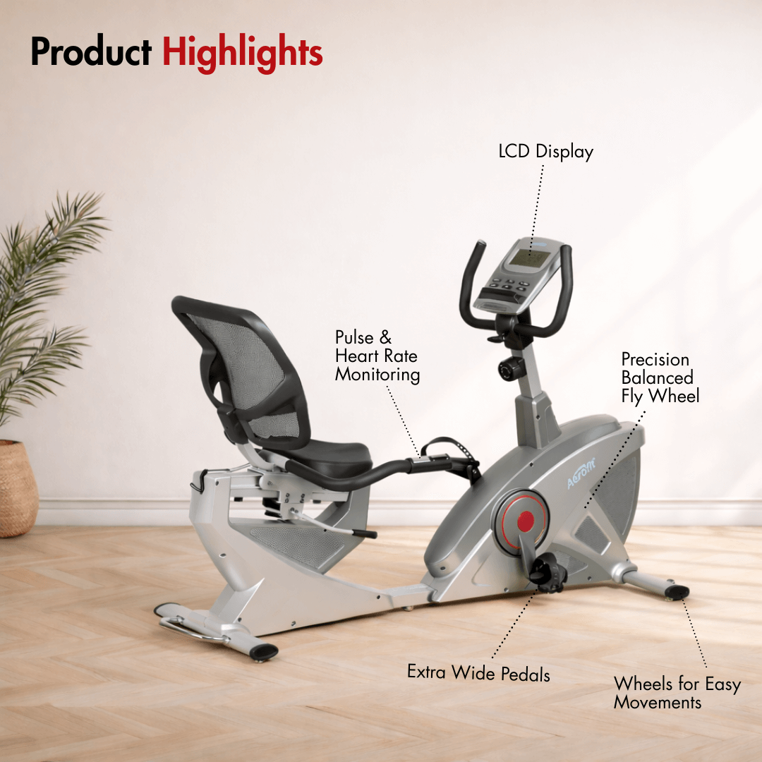 Ideal for daily fitness routines, the Aerofit AF-665R Recumbent Bike combines user-friendly design with smooth performance, making it suitable for beginners, seniors, and rehabilitation-focused users alike. This bike has been made with a durable and sturdy frame, which measures 69” (L) x 27” (W) x 43” (H), offering a stable footprint without occupying excessive floor space.