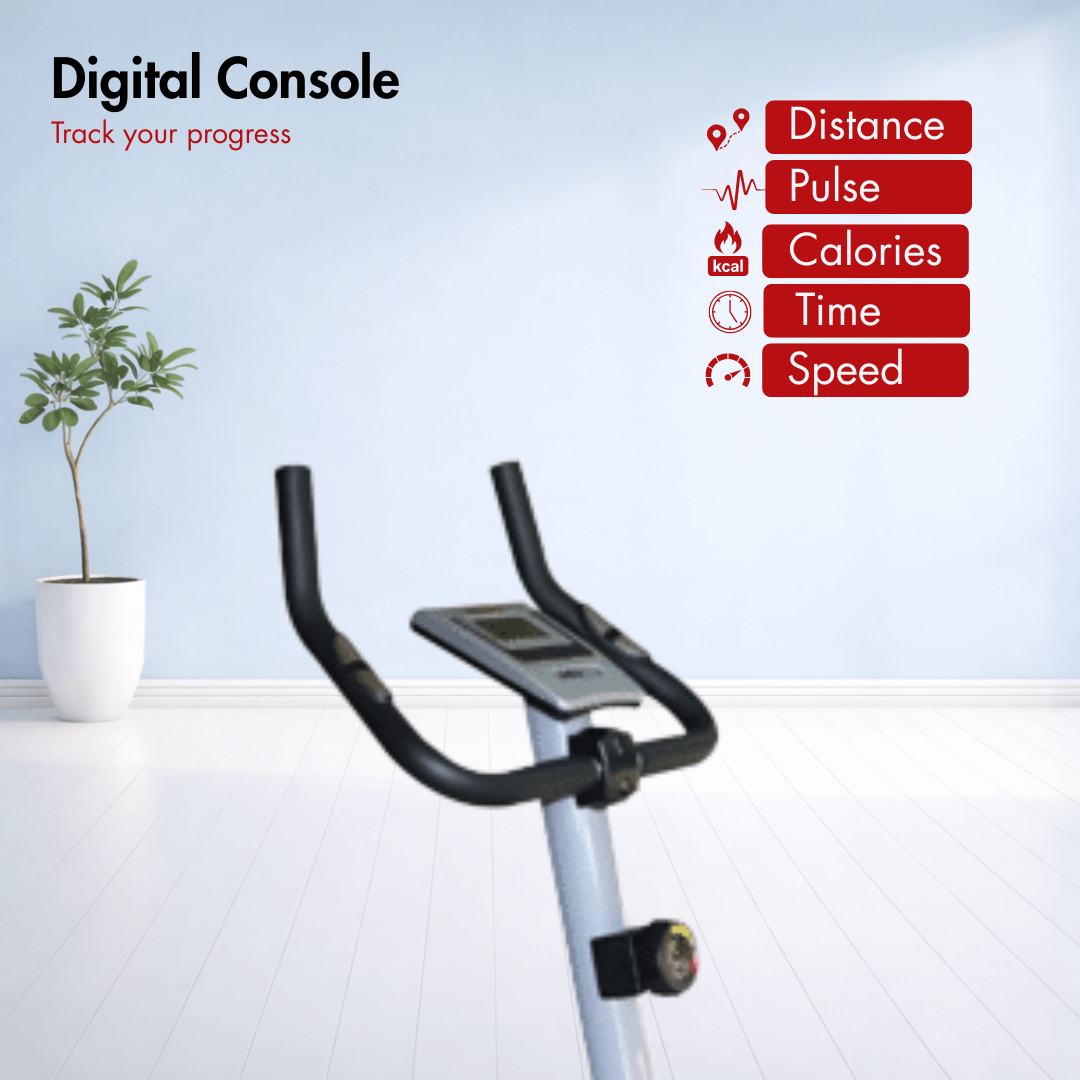 A comfortable designed seat with 8-level of vertical adjustment allows proper posture, reducing strain during longer sessions. The U-bar handle includes in-built contact heart rate sensors, helping users monitor effort levels effectively. This upright bike comes equipped with LCD display console which provides multi-feedback readouts including scan, time, speed, distance, odometer, pulse, and calories, making it easy to track progress over time.