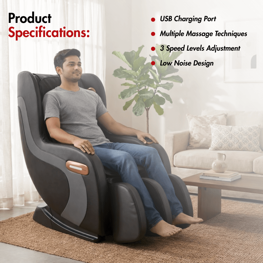 This also comes with a waving air massage system that targets the waist and hip area for gentle shaping, while the leg rest helps soothe tired lower muscles, complementing routines that involve leg massagers or lower-body training. Additional lifestyle features such as Bluetooth music speakers, an embedded armrest controller, and a USB charging port further enhance its everyday usability.