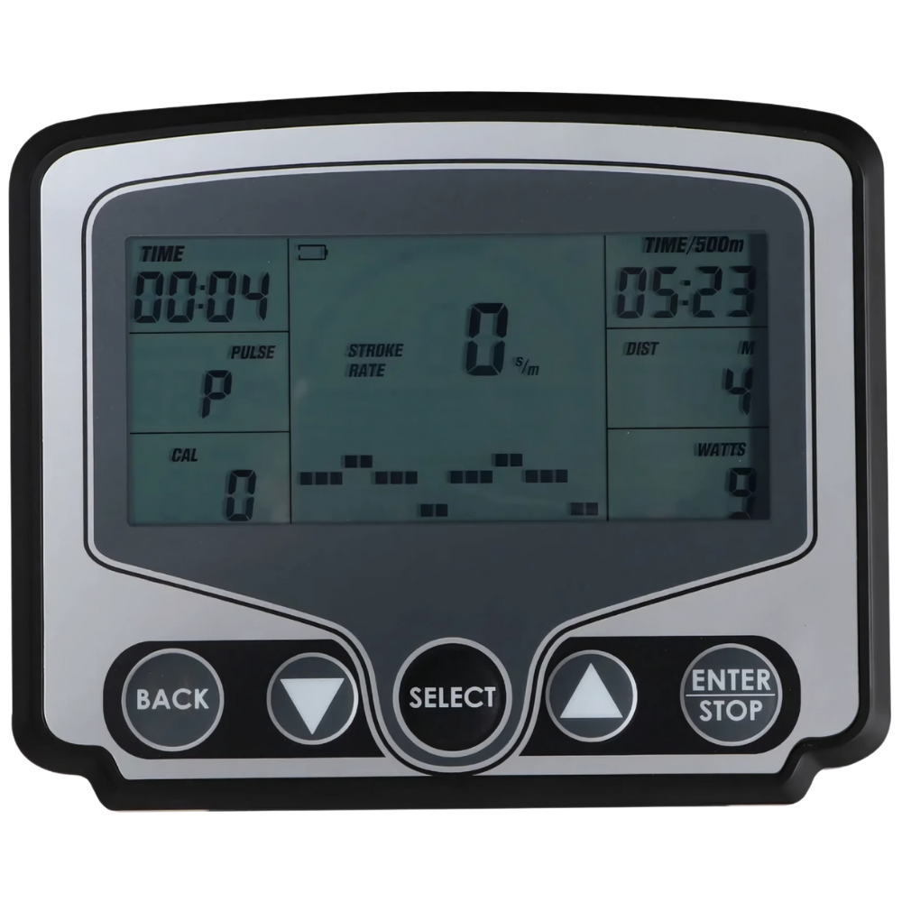 • Backlit screen which displays Stroke/RATE, Time, Distance/Cycle, Pulse, Calories, Watts; Paddle Width, Buzzer; Interval Program Profile