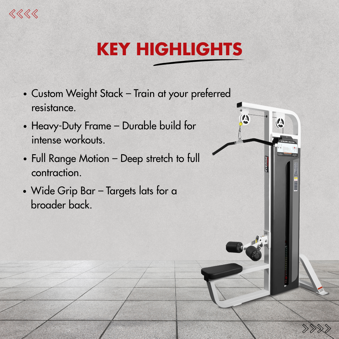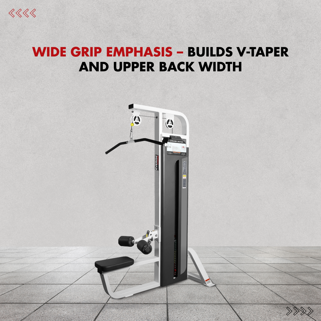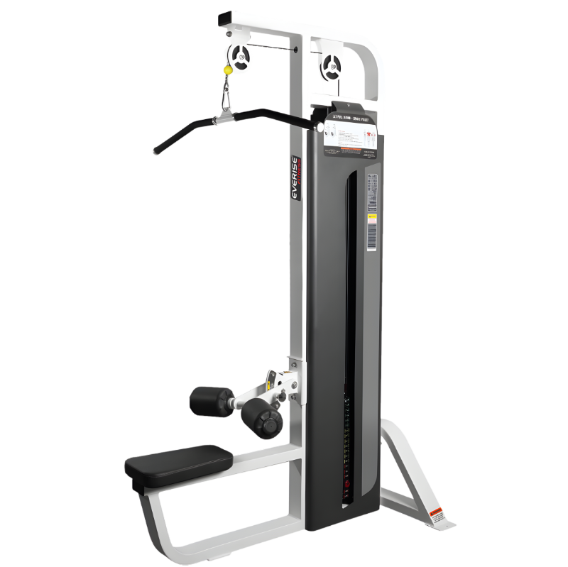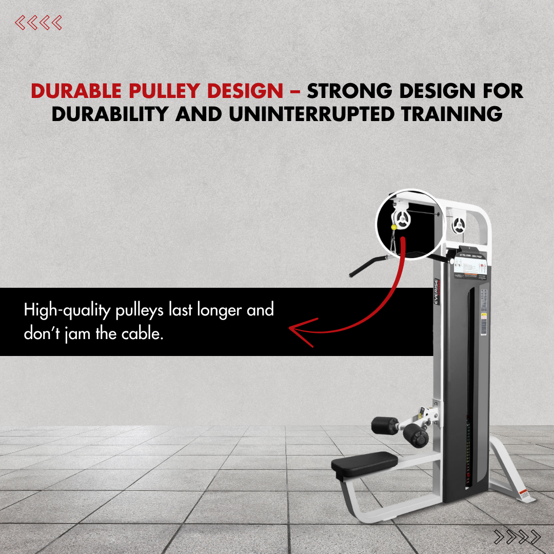 The Lat Pull Single Pulley features an adjustable thigh pad to secure the user during the exercise.
