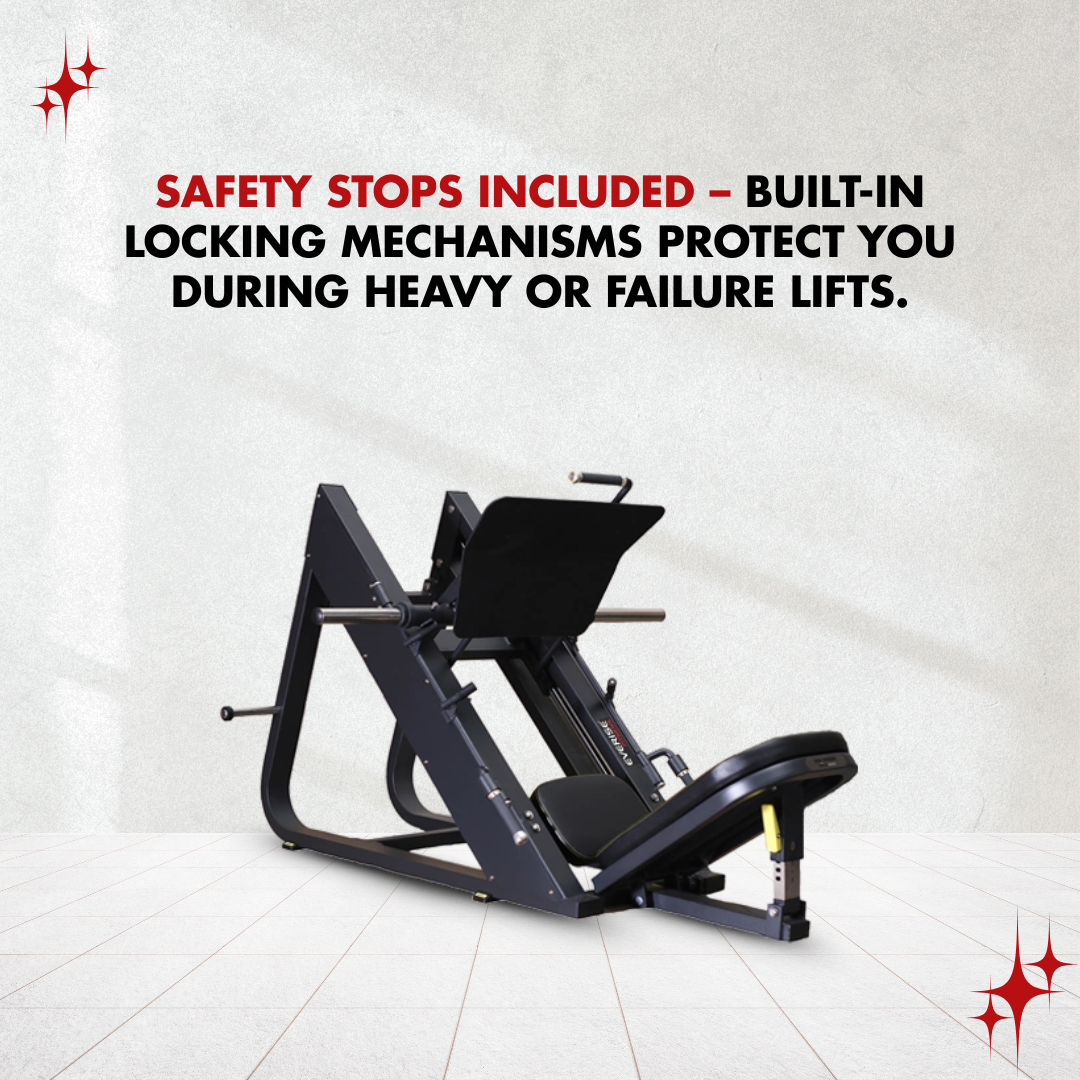 45 degree angle for accurate training. Carriage travels on linear bearing for friction free & smooth performance. Big non-skid high quality rubber foot platform. Ergonomic adjustable seat protects lower back. Inbuilt plate holder allows easy loading & unloading of weight plates. A stopper minimizes risk while performing exercise