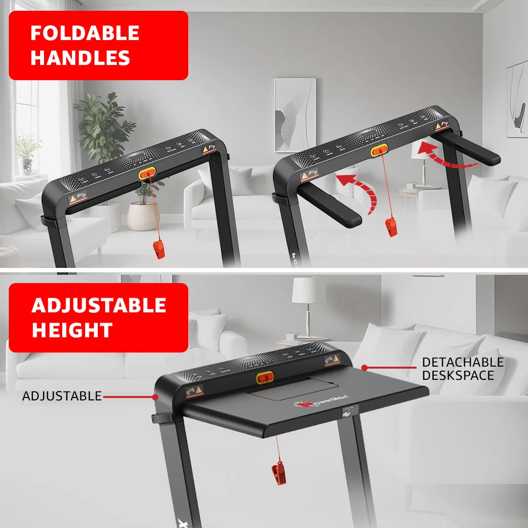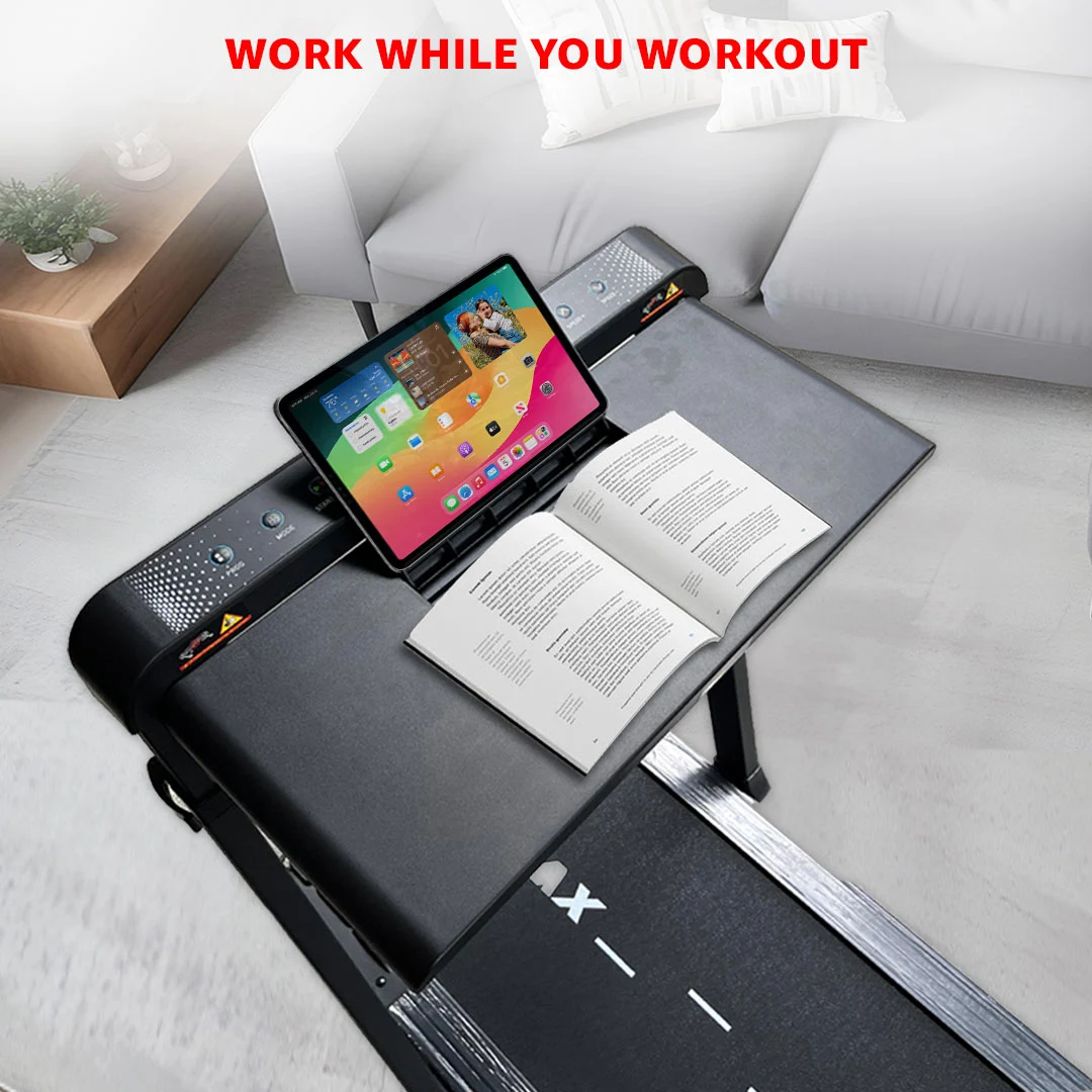 The dual LED display keeps track of time, speed, distance, and calories, while 12 pre-set workout programs and 3 target-based modes offer structured training options. With Bluetooth speakers, an iPad/mobile holder, and a removable work desk, this treadmill doubles as a productivity station—ideal for multitasking professionals.