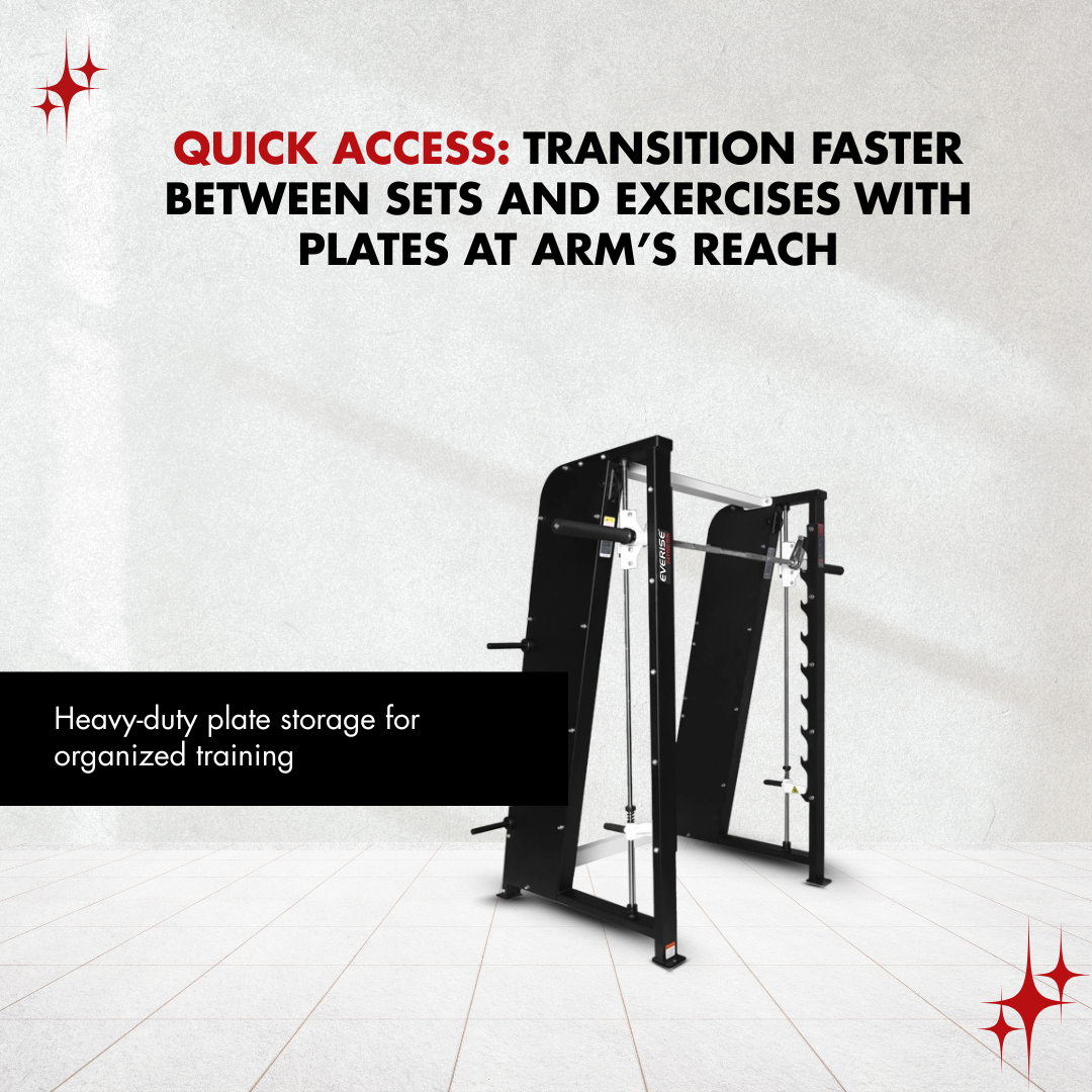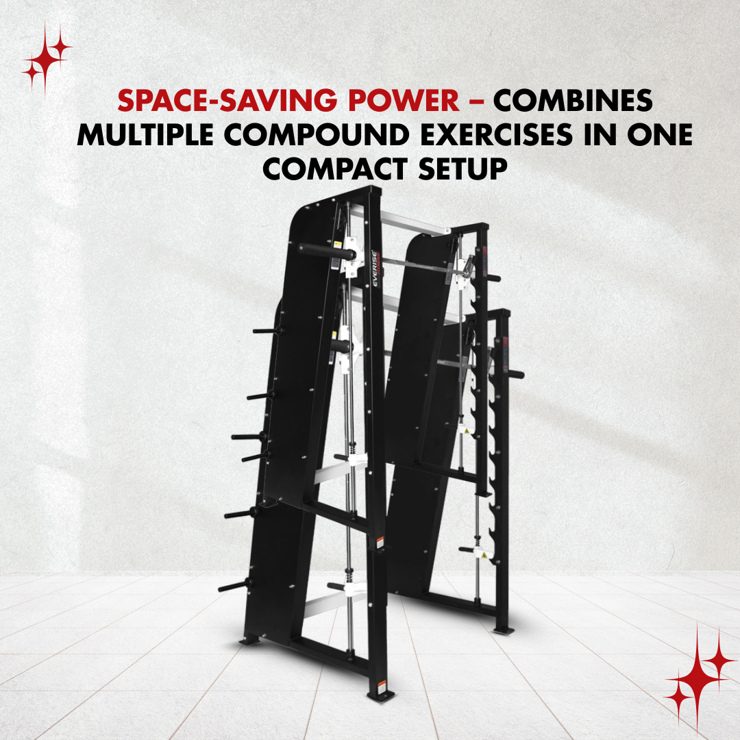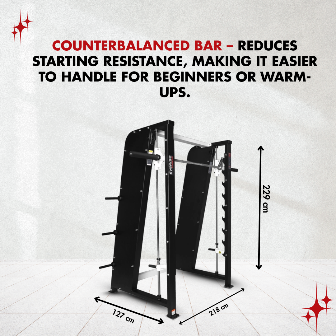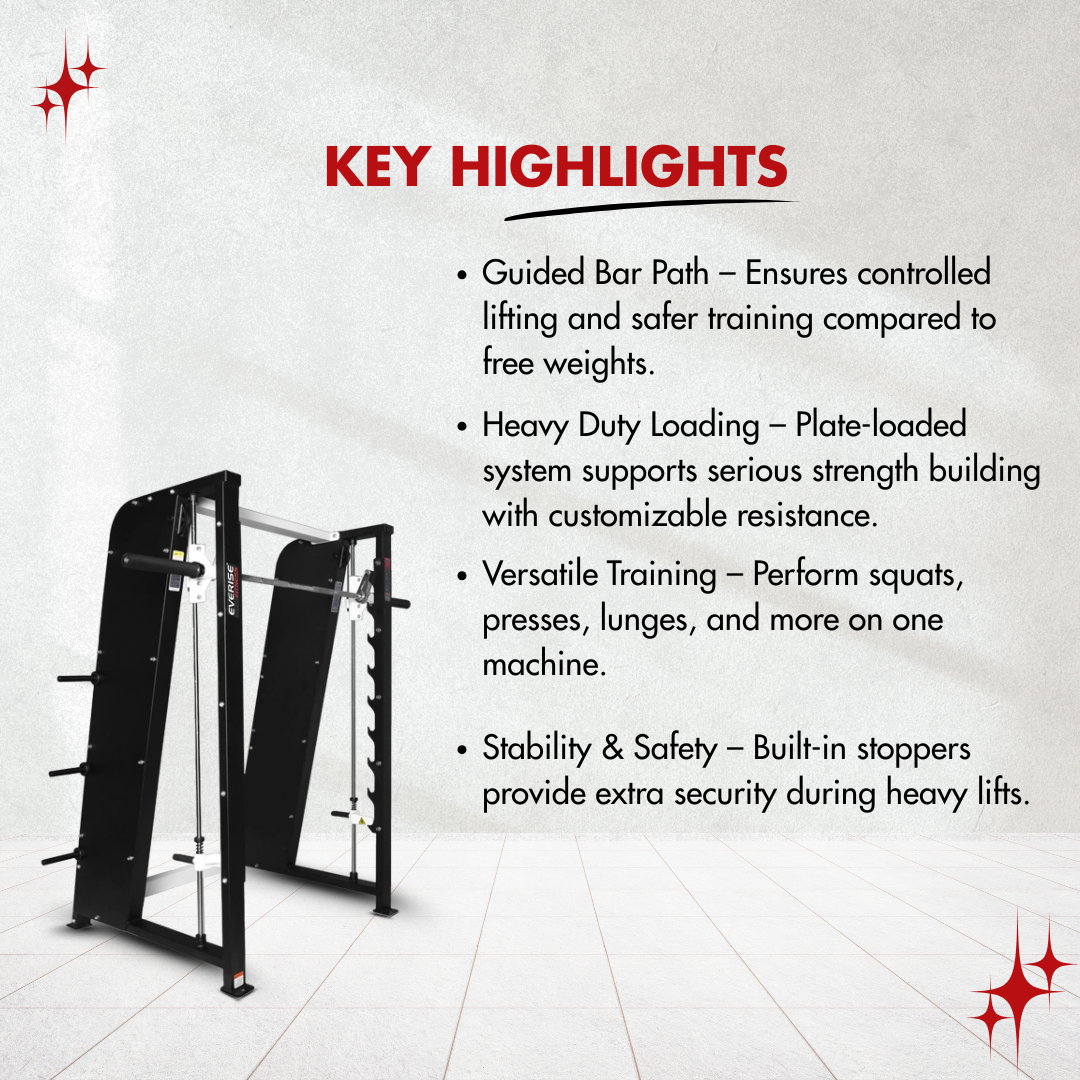 Ideal and versatile unit for beginners as well as professional bodybuilders. Engineered with racking pegs for 10-weight bar adjustments. Olympic bar travels on linear bearings for smooth operation. Counterbalance system allows for lifting of actual weight. Extra feature of shroud is provided to make the machine dust free and to look elegant.