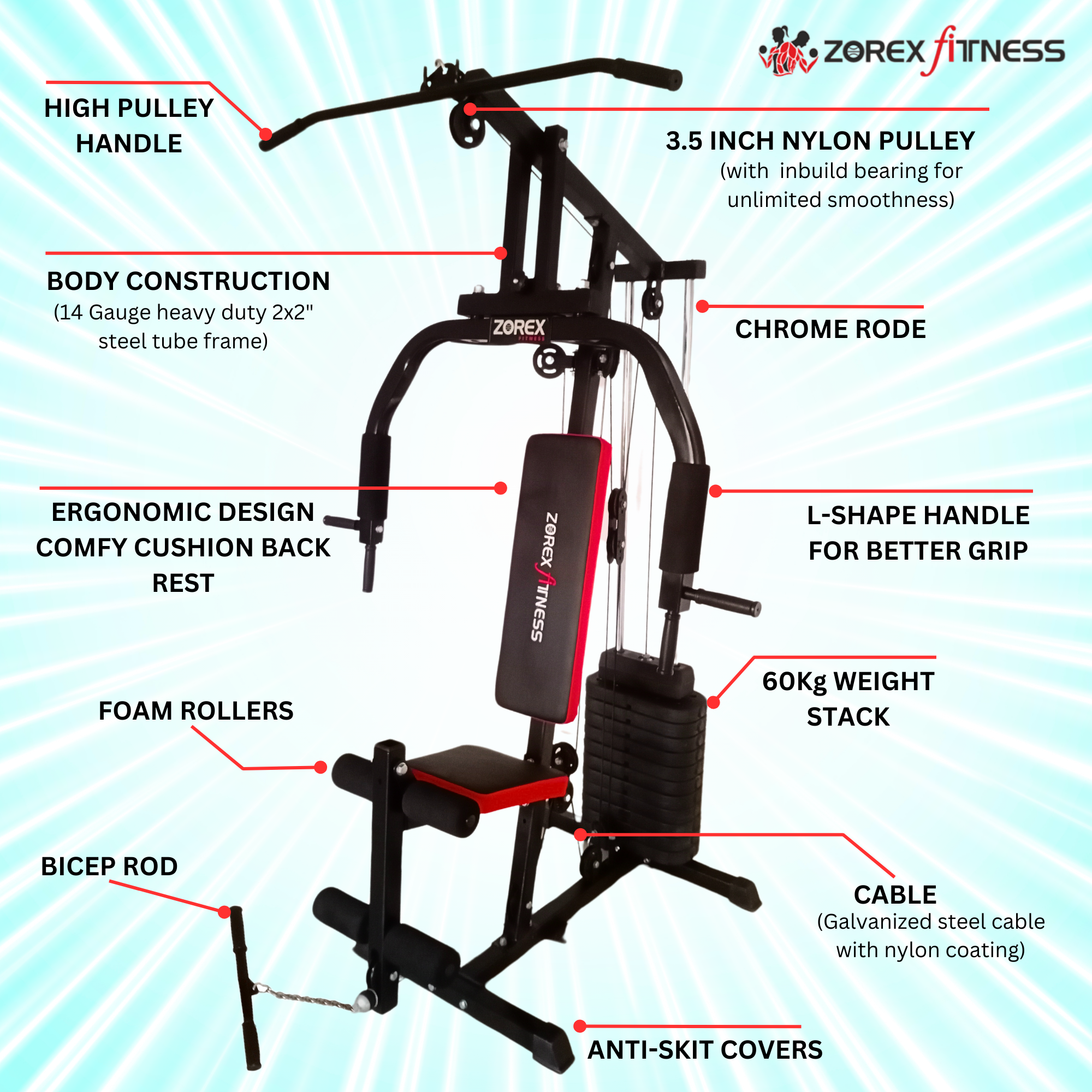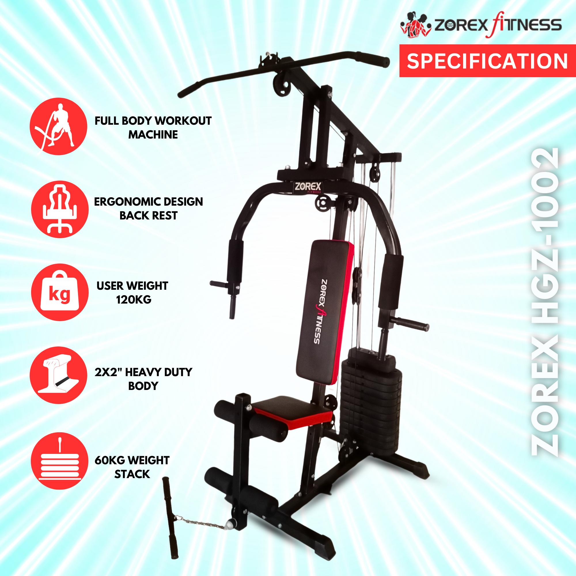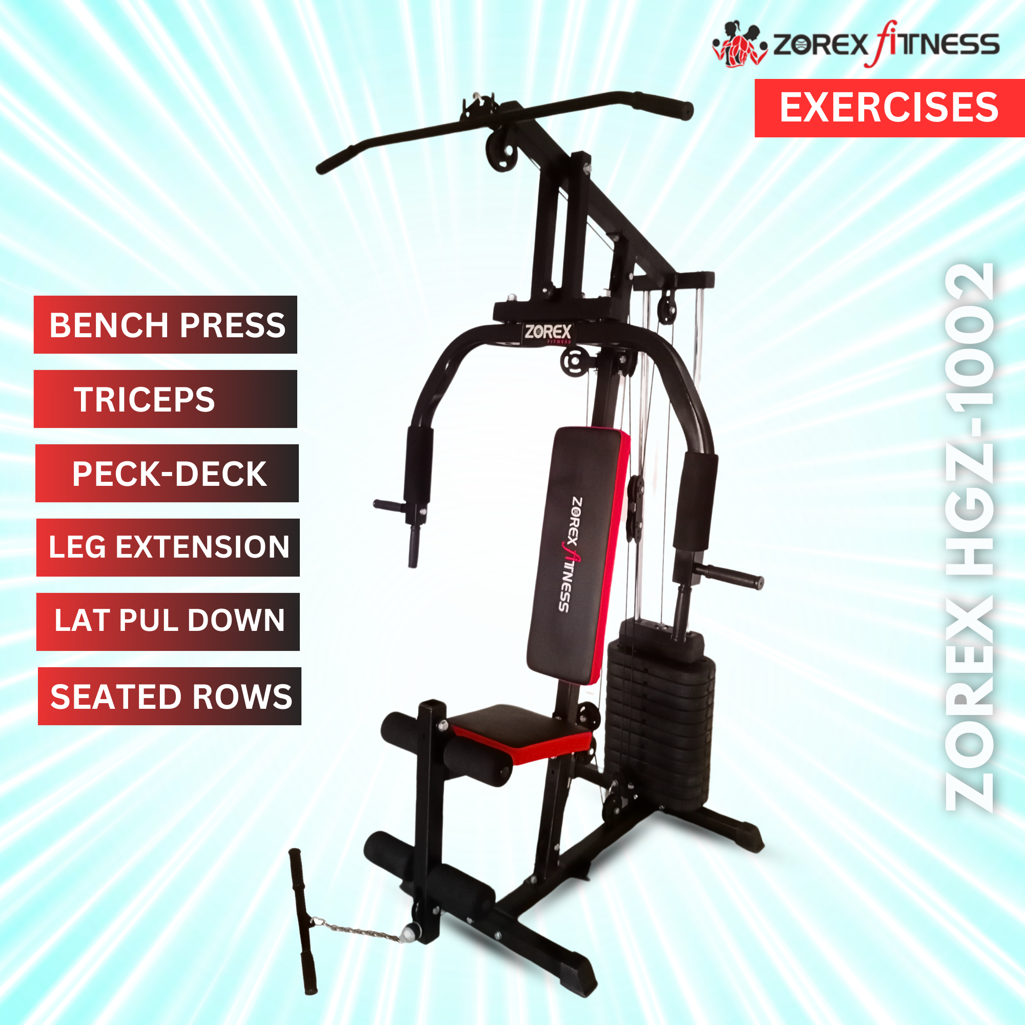 Ideal for home users looking to replace multiple machines, the Zorex Fitness HGZ-1002 supports a wide range of exercises while saving space. It’s a smart choice for anyone building a complete home fitness environment with quality gym equipment and accessories.